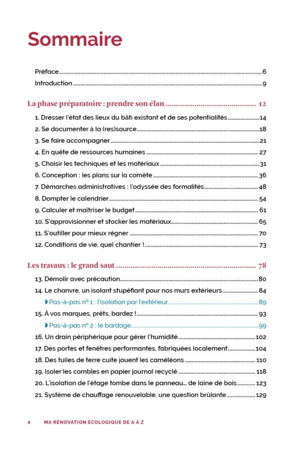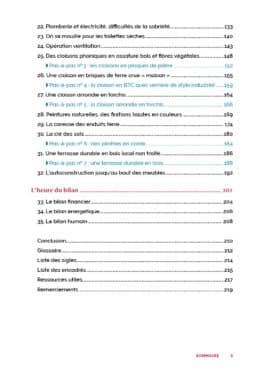 - Les travaux, avec des pas-à-pas très détaillés : isolation des murs en paille de chanvre ; bardage en bois non traité ; portes et fenêtres locales ; isolation des combles en ouate de cellulose recyclée ou en panneaux de fibre de bois ; cloisons en ossature bois et fibres végétales, en briques de terre crue, en torchis de terre-paille-sciure ; peintures naturelles et enduits d’argile ; parquets en liège, en chêne et en bambou…