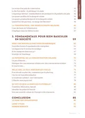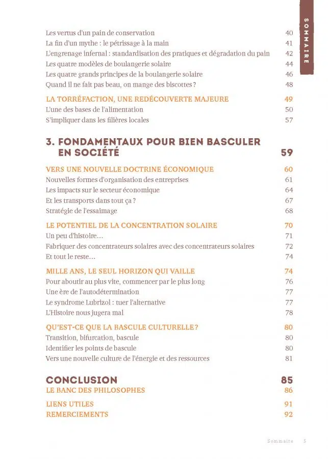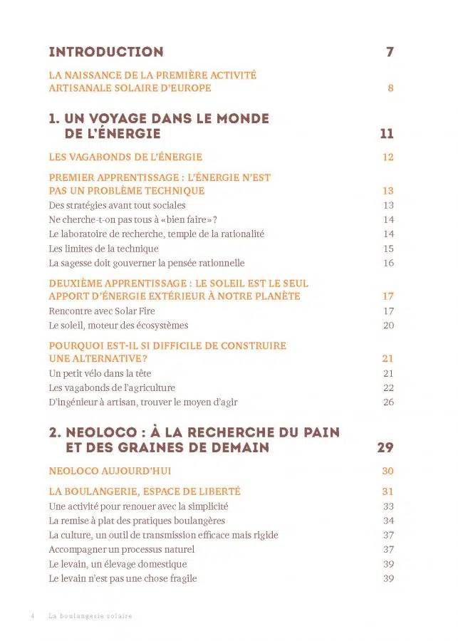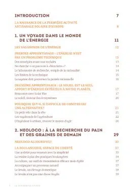 Ce livre propose une exploration du pouvoir de l’énergie solaire (au-delà du photovoltaïque et du solaire thermique) pour sortir la boulangerie de sa dépendance aux énergies dangereuses pour le futur, mais également une réflexion sur l’utilisation de l’énergie solaire et sur nos comportements face à l’énergie en règle générale.