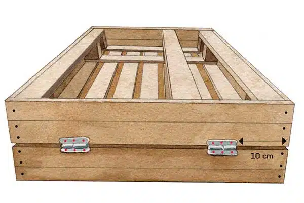 11. Disposez la partie couchage à l’endroit sur le sol et le dossier à l’envers par-dessus (comme sur le dessin). Fixez 2 charnières à 10 cm des bords avec 12 vis de 3,5 cm.