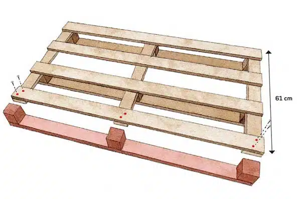 2. Dans la chute, conservez l’une des 2 planches de 120 cm avec ses 3 plots (sans les détacher). Refixez l’ensemble (en rose) à la palette (qui mesure désormais 120 x 61 cm) pour la reconstituer. Pour ce faire, utilisez 6 vis de 3,5 cm insérées dans les plots.