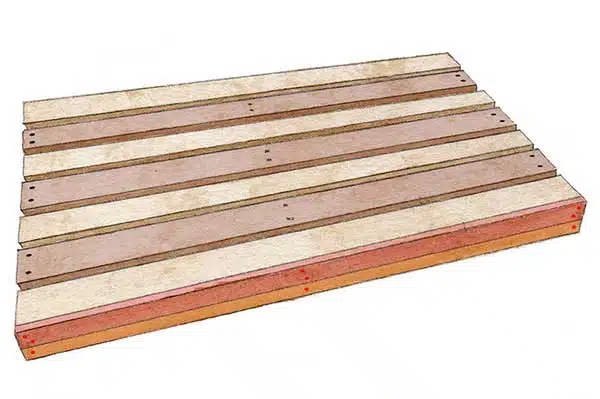 4. Pour recouvrir les côtés longs de cette palette, fixez les 4 autres planches après en avoir retaillé 2 à 5 cm de largeur. Sur chaque côté, fixez donc 1 planche de 7 cm de largeur (en rose), ainsi qu’une planche de 5 cm de largeur (en orange), juste en dessous, avec 9 vis de 3,5 cm.