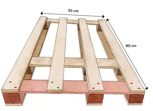 7. Dans la chute, récupérez la planche de 61 cm de longueur et ses 3 plots (sans les détacher). Refixez l’ensemble (en rose) à la palette (qui mesure désormais 80 x 61 cm) pour la reconstituer. Pour ce faire, utilisez 12 vis de 3,5 cm (en rouge) insérées dans les 3 plots et 2 vis de 3 cm (en vert) insérées dans la planche.
