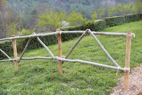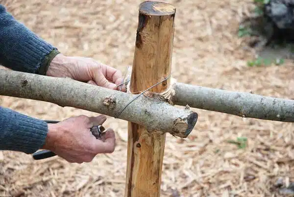 1. Plantez les piquets tous les 1,50 m en les enfonçant de 50 cm. Fixez-y les tronçons à l’aide d’une ligature en fil de fer, sur deux niveaux horizontaux, en positionnant le premier à 35 cm du sol, puis le second 50 cm au-dessus.