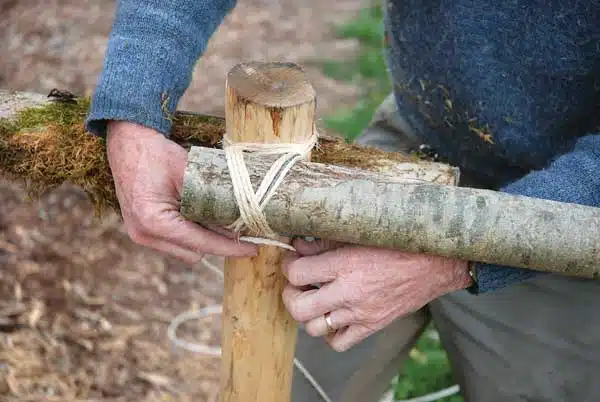 2. Après la ligature, habillez la fixation en nouant par-dessus de la ficelle de sisal en suivant le fil de fer et en croisant.