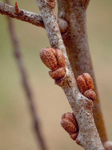 C’est un épineux buissonnant, à port dense et étale, dont les jeunes rameaux sont couverts d’écailles couleur de rouille.