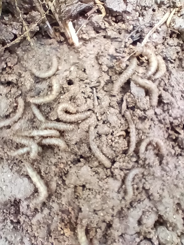 Maximilien Quvrin, entomologiste et collaborateurs des 4 Saisons nous donne quelques précisions. Il ne s’agit pas de chenilles mais de larves de tipules (Diptères) aussi appelées “cousins”. Ces insectes ressemblent à de grands moustiques mais ne piquent pas. Les adultes sont surtout visibles au printemps et en automne. Ils sont floricoles ou ne se nourrissent pas. Les larves sont, selon les espèces, consommatrices de déchets organiques dans les sols humides et frais et parfois même en milieu aquatique comme Tipula maxima. Celles-ci ne sont absolument pas nuisibles au potager et contribuent même à l’enrichissement et l’aération du sol. Chez d’autres espèces en revanche, les larves mangent racines, collets des plantes et jeunes pousses et peuvent causer des dégâts aux cultures et parcelles gazonnées (Pour ce dernier cas, il semble exister un traitement en lutte biologique à base de nématodes prédateurs). Une diminution de l’humidité du sol (donc des arrosages) leur serait également néfaste. La présence de choux, à proximité de l’endroit où se cachent ces larves pourrait orienter une identification plus précise. La tipule potagère (Tipula oleracea) ou tipule du chou est très commune, et semble apprécier ce légume en particulier…