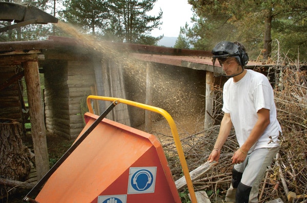 - Système à rotor lent : il hache des branches jusqu’à 40 mm de diamètre tout en les écrasant (« défibrage »), en faisant très peu de bruit et sans trop de risques de projection, de bourrage ou de casse. En dépit de la vitesse de rotation très lente (40 à 60 tours par minute, contre plus de 3 000 pour les systèmes classiques), le débit est important, de l’ordre de 100 à 150 kg par heure.