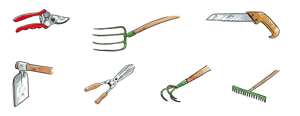 La cisaille : pour tailler les haies, mais aussi pour couper de petites surfaces d’engrais vert. Choisir un modèle comportant des butoirs en caoutchouc.