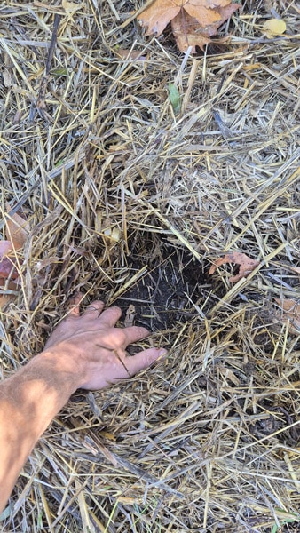 - Le paillage, c’est la couverture protectrice : il limite le dessèchement, bloque en partie les herbes indésirables, nourrit le sol en se décomposant. Dès la première année, essayez de pailler toutes les surfaces nues avec ce que vous trouvez. Peu importe si ce n’est pas parfait : ce qui compte, c’est de couvrir le sol.