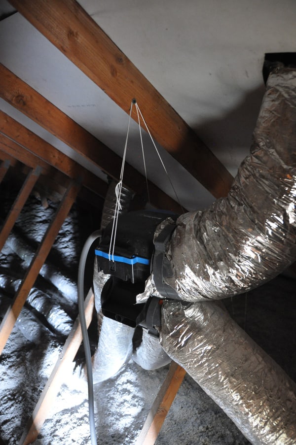 Nos combles perdus facilitent l’installation du réseau de gaines d’évacuation, en évitant les coudes qui induiraient des surcoûts et surtout des pertes de charge affaiblissant le débit d’air. Ces gaines sont entourées d’un manchon isolant mais sont tout de même placées autant que possible sous la ouate de cellulose. Cela évite que l’air chaud qui est extrait de la maison se condense dans les gaines en hiver, provoquant des moisissures.