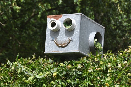 Je ne résiste pas aux allures de bonhomme-robot de l’ancien caisson de VMC et décide de faire de ce vestige du passé de notre maison une mascotte. Trônant sur la clôture qui délimite notre domaine, de sa bouche moustachue formée par un câble de l’ancienne installation électrique, Victor Marie-Claire (alias VMC) sourit aux passants.