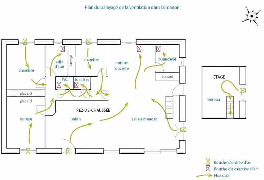 Mais c’est ce que nous décidons alors. Plus low-tech et facile à entretenir, cette dernière dispose d’un moteur qui extrait simplement l’air vicié par des bouches d’aspiration positionnées dans les pièces de service ou « humides » (cuisine, salle d’eau, toilettes et buanderie) afin de le rejeter dehors. L’air neuf prend sa place en entrant par des fentes ménagées dans les pièces dites principales : séjour, salon, chambres et bureaux (voir plan des flux d’air ci-dessous).