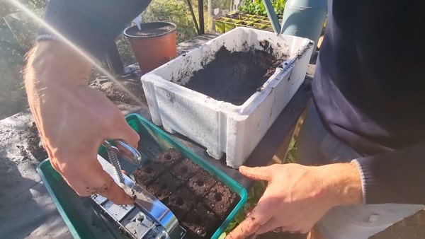 J’ai souvent testé cette technique ces dernières années et je me suis procuré des presses-mottes de toutes les tailles. De la plus petite, 1 cm, jusqu’à 5 cm. C’est intéressant mais j’y vois un gros désavantage. Les mottes sèchent vite. Il faut alors les installer dans un récipient qu’on peut remplir d’eau pour arroser par capillarité. Il faut aussi bien « serrer » les mottes pour éviter qu’elles ne se désagrègent. Vous pouvez essayer pour vous faire votre propre avis. Les professionnels l’utilisent avant tout pour un gain de place par rapport aux godets, mais aussi pour un gain de temps et donc d’argent : la reprise est plus rapide en terre. Pour nous, amateurs, si le plant reprend avec un peu moins de vigueur, c’est à mon sens peu important.