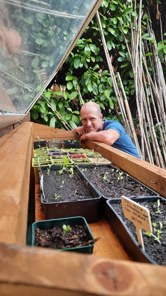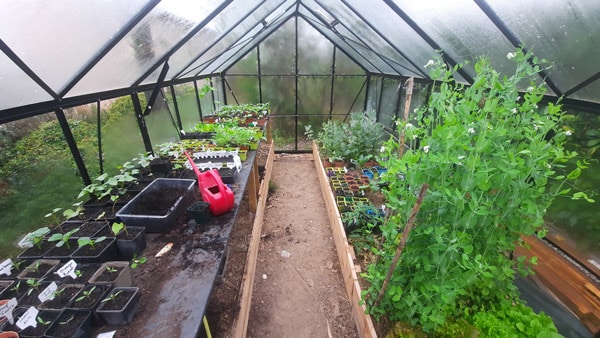 Voici comment j’essaie de gérer au mieux mes semis en contenant. Avec les années, je me suis peu à peu équipé. Au début, j’installais mes semis à la maison, derrière une grande baie vitrée. La chaleur y était correcte, mais pas idéale, et surtout je manquais rapidement de place. Ensuite, j’ai investi dans une serre : d’abord en polycarbonate, puis dans une serre en verre, bien plus performante. Je l’utilise avant tout comme serre à semis, plus que comme lieu de culture. J’y installe en début de saison mes semis de petits pois, fèves, mangetouts, choux, betteraves, blettes… Même si parfois je les entrepose dans un premier temps à la maison pour les faire germer plus rapidement. Il y fait tellement plus chaud en février, mars, surtout la nuit ! Mais sitôt les semis germés, je privilégie la lumière et mes semis transitent alors dans la serre.
