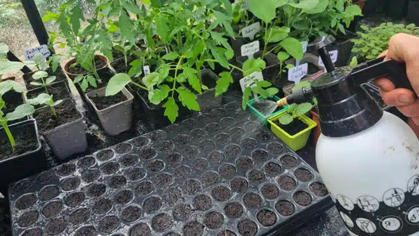 Pour arroser, privilégiez une méthode douce. Un pulvérisateur est idéal pour ne pas déranger les graines. Un arrosoir à bec de cygne, qui délivre un filet fin, est très bien aussi : c’est ce que j’utilise le plus. Certains percent une bouteille en plastique, ce qui marche très bien aussi. Une fois les plants plus robustes, vous pouvez passer à un arrosage plus franc, à l’arrosoir classique.