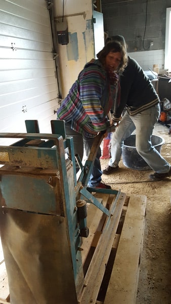 La presse Géo50 nous est louée (10 c€ par BTC) par un artisan chez qui je vais la chercher à 35 km de mon chantier. Il la charge facilement dans ma remorque avec un transpalette, mais pour la décharger chez nous, vu le poids impressionnant du bestiau, nous devons faire appel au tracteur de nos voisins agriculteurs !
