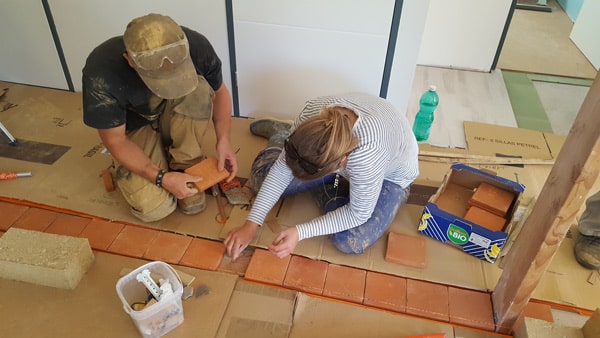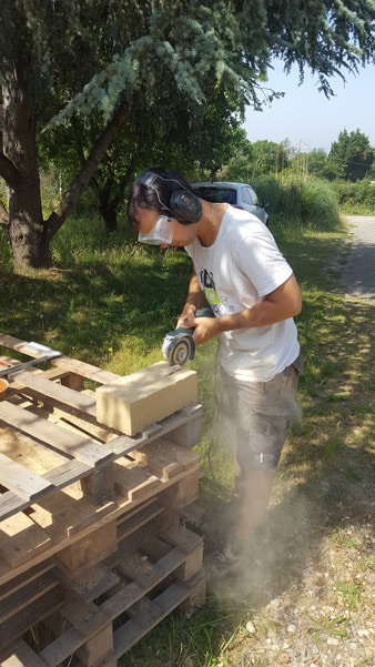 D’une rangée à la suivante, nous décalons les joints verticaux d’au moins le quart de la longueur de brique. Il est donc parfois nécessaire de couper les briques en bout de rang ; pour ce faire, nous utilisons une meuleuse et portons des lunettes de protection et un casque anti-bruit.