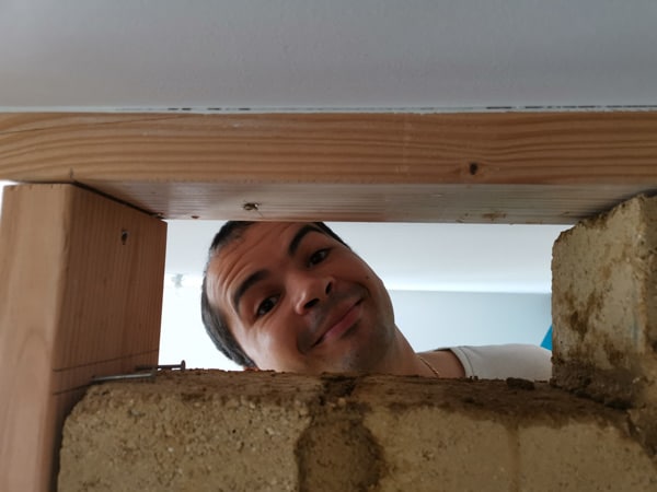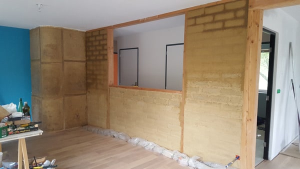 Malgré le temps et l’énergie qu’elle réclame, je tiens absolument à ériger une cloison en briques de terre compressée (BTC). Et quitte à lui consacrer tant de travail, autant lui offrir une place de choix : elle trônera majestueusement en plein milieu de la maison. Au-delà de l’indéniable esthétique qu’elle offre au salon et au couloir (ainsi qu’aux autres pièces d’où elle est visible), son rôle est aussi important pour le confort de vie.
