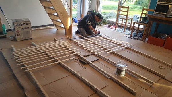 J’enserre des vitres entre les lattes de bois peintes. Les vis insérées côté couloir harponnent les lattes de l’autre côté en se glissant dans l’écart laissé entre les plaques de verre.