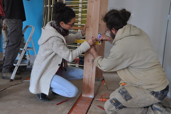 Pour démarrer le montage de la cloison, un cordeau est tendu entre les montants d’ossature : il permet de poser au sol une rangée de carreaux de terre cuite alignée à l’aplomb de la lisse haute en bois fixée au plafond. Ainsi, en cas d’accident, de dégât des eaux ou d’un passage de serpillère trop généreux, l’eau ne sera pas en contact avec la terre crue, qui sans cela risquerait de se transformer en gadoue.