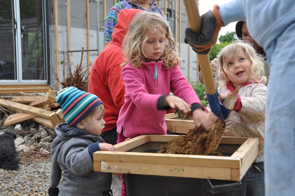 La taille des granulats contenus dans la terre doit être inférieure à 10 % de la largeur de brique. Je fabrique donc des tamis avec du grillage à maille de 10 mm enserré par un cadre en chutes de tasseaux. Et nous appelons à la rescousse amis et famille pour accélérer cette tâche, simple mais gourmande en temps, qu’est le tamisage.