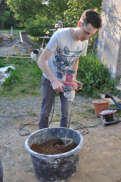 Nous mélangeons au malaxeur électrique 25 vol. de terre avec 5 vol. de sable (et ici 3 vol. de chaux en option, 5 à 15 % du volume terre-sable selon la couleur souhaitée). Nous transvasons au moins une fois le mélange dans un autre bac avant de remélanger, sinon une partie de la terre reste collée dans les coins et au fond du récipient sans que le malaxeur la lie aux autres ingrédients.