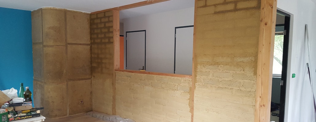 Malgré le temps et l’énergie qu’elle réclame, je tiens absolument à ériger une cloison en briques de terre compressée (BTC). Et quitte à lui consacrer tant de travail, autant lui offrir une place de choix : elle trônera majestueusement en plein milieu de la maison. Au-delà de l’indéniable esthétique qu’elle offre au salon et au couloir (ainsi qu’aux autres pièces d’où elle est visible), son rôle est aussi important pour le confort de vie.